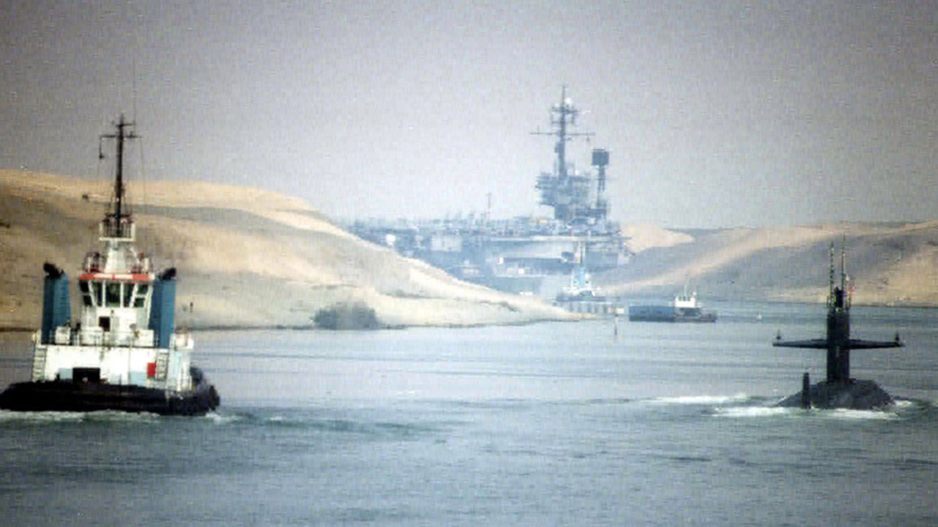 Un porte avion américain s’introduit dans le canal de Suez, suivi d’un sous-marin et d’un bateau égyptien (1996). Domaine public.